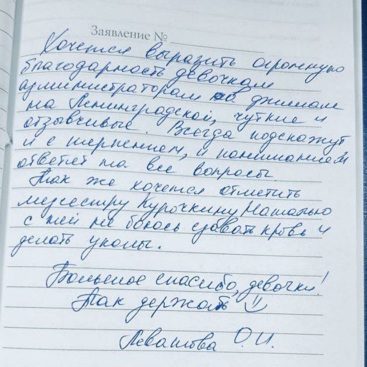 «Хочется выразить огромную благодарность девочкам администраторам филиала на Ленинградской, чуткие и отзывчивые. Всегда подскажут и с терпением и пониманием ответят на все вопросы. Так же хочется медсестру Курочкину Наталью (Курочкина Н.), с ней не боюсь сдавать кровь и делать уколы. Большое спасибо, девочки! Так держать)»