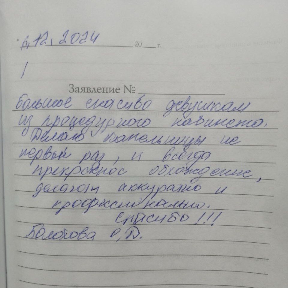«Большое спасибо девушкам из процедурного кабинета. Делаю капельницы не первый раз и всегда прекрасное обхождение, делают аккуратно и профессионально. Спасибо!!!»