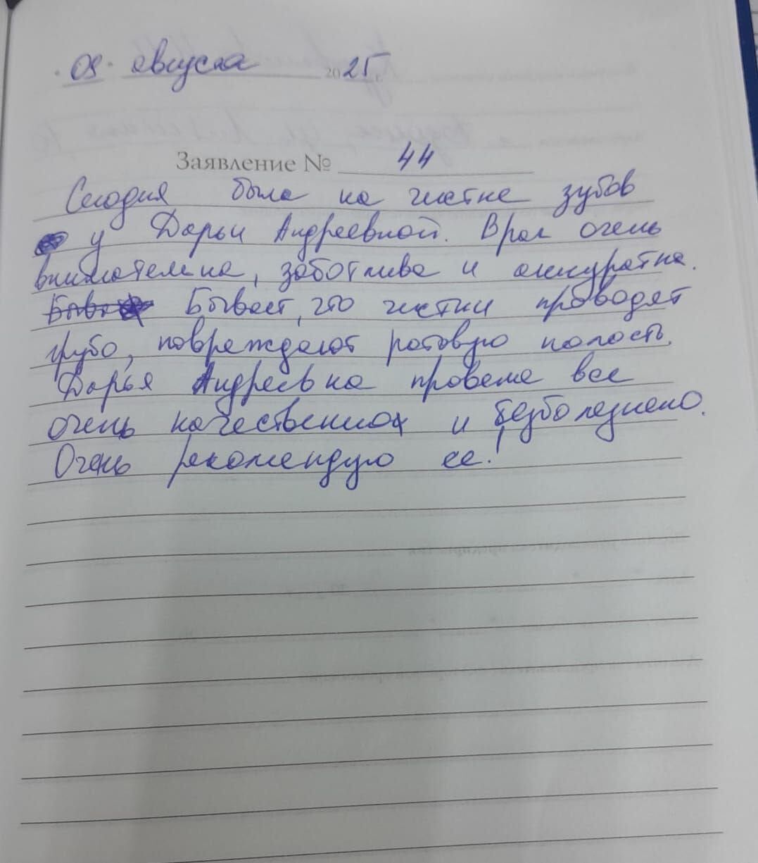 "Сегодня была на чистке зубов у Дарьи Андреевны (Швейцова Д. А.). Врач очень внимательна, заботлива и аккуратна. Бывает что чистки проводят грубо, повреждая ротовую полость. Дарья Андреевна провела все очень качественно и безболезненно. Очень рекомендую ее."